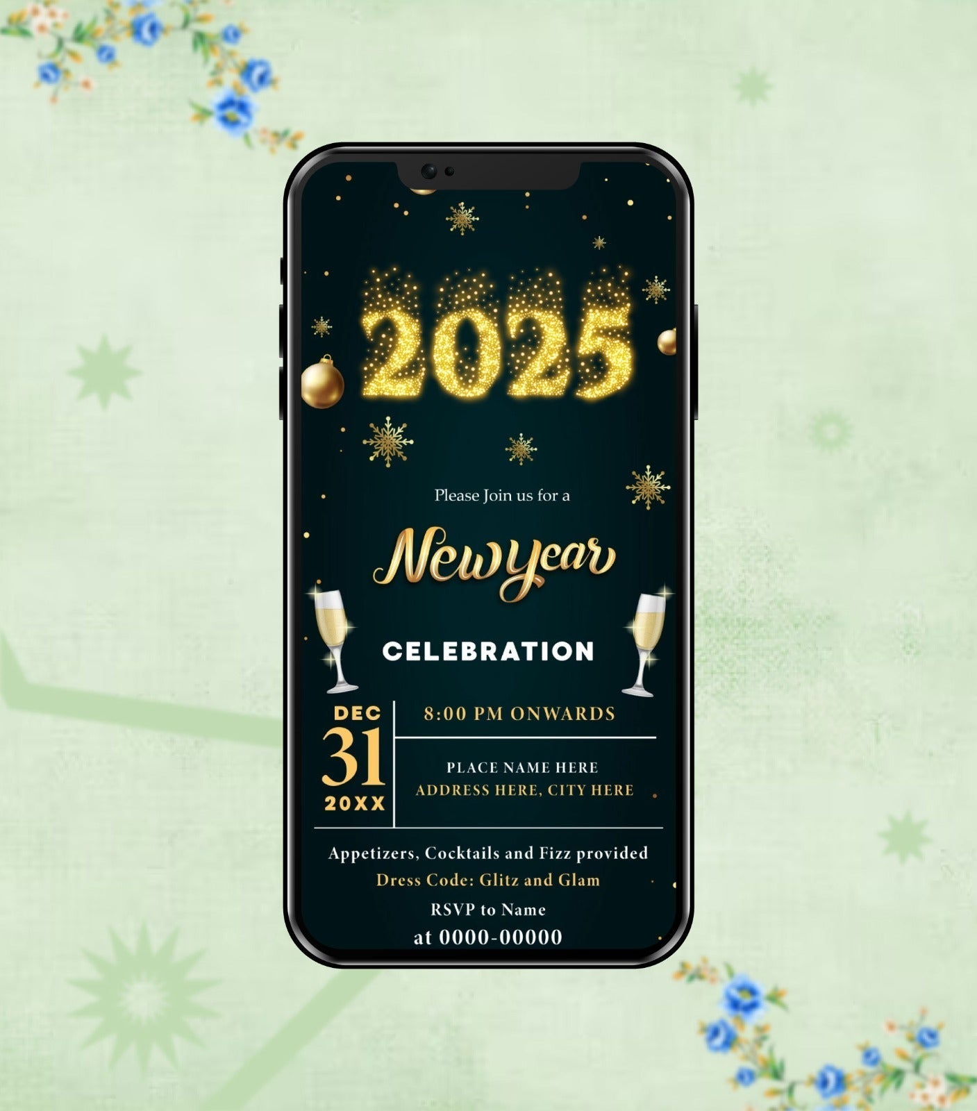 #NewYear2025, #NYEInvitation, #DigitalPartyInvite, #GlitterAndGlamCelebration, #EcoFriendlyInvitation, #LuxuryEventInvite, #NewYearPartyCard, #CustomNYEInvite, #FestiveInvitation, #NewYearCelebration2025